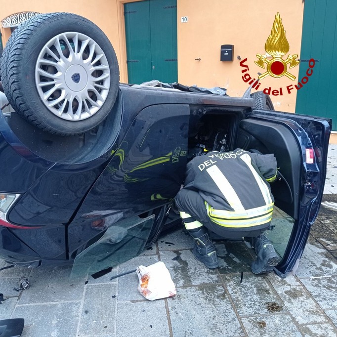 Incidente nel primo pomeriggio di fronte alla parrocchia di Cavezzo. Nel ribaltamento dell'auto il conducente, un 43enne, ha perso la vita sul colpo.