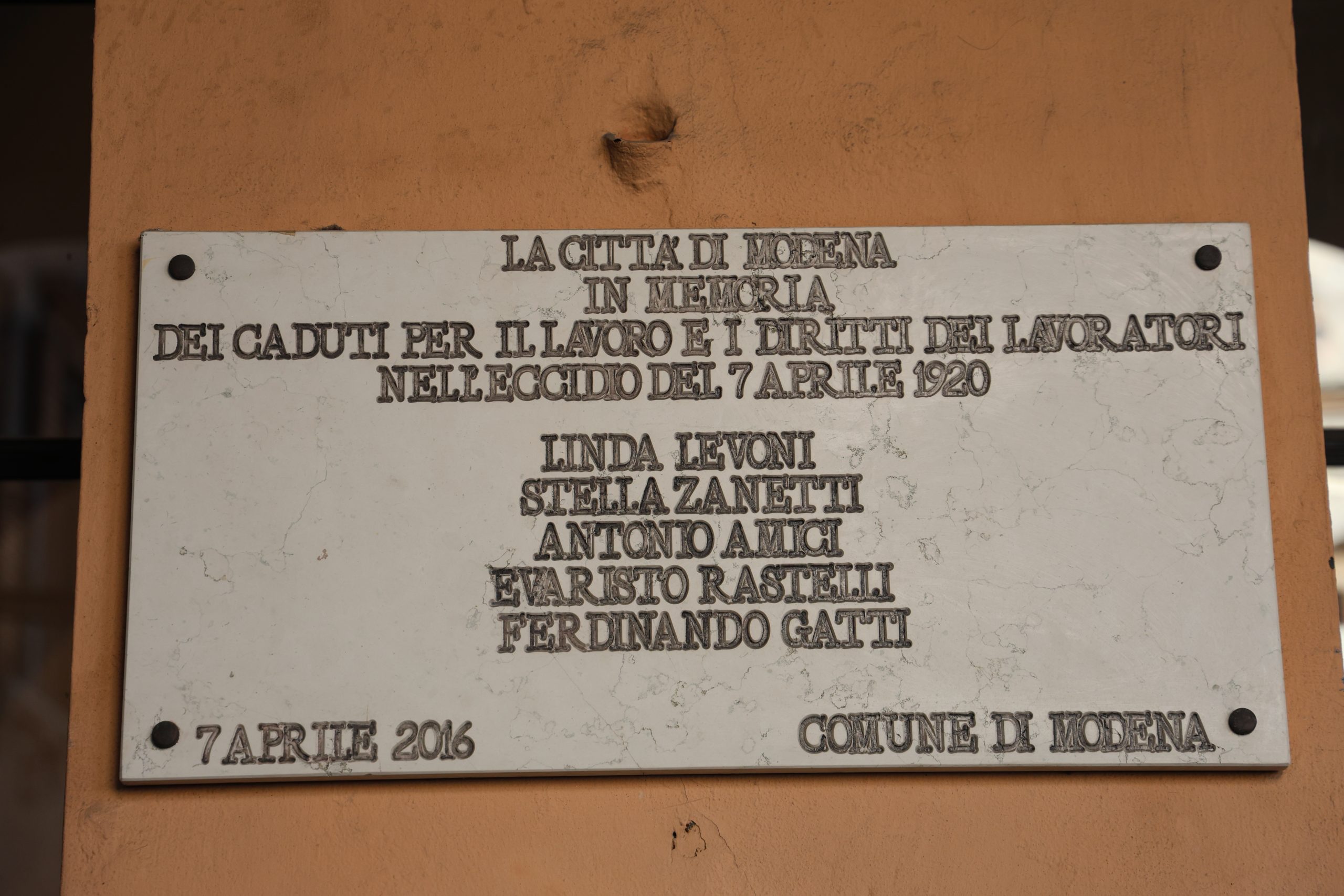 Il 7 aprile 1920, durante il primo di quattro giorni di sciopero proclamati dalle due Camere del Lavoro (quella Sindacalista e quella Socialista) per protestare contro l’uccisione a San Matteo della Decima di otto lavoratori e dell’oratore durante una manifestazione a sostegno di una vertenza agraria, i lavoratori modenesi si radunarono in piazza Grande. La forza pubblica aprì il fuoco contro di loro, uccidendo quattro persone e provocando la morte di una quinta a seguito delle ferite riportate.