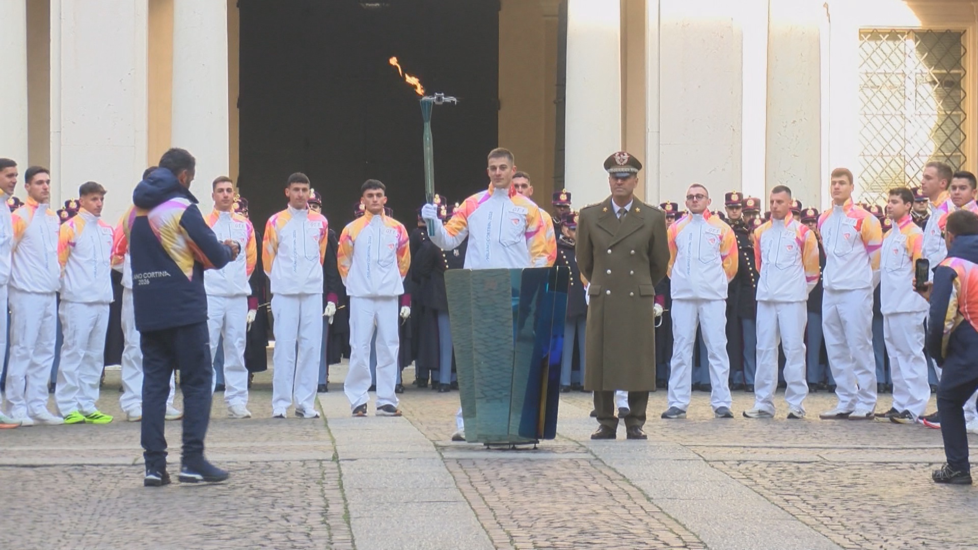 Nel momento più solenne c’è un silenzio di sospensione. La parata dei cadetti, insieme alle più alte istituzioni militari dell’accademia di Modena, si è radunata intorno al fuoco del braciere olimpico per celebrare il passaggio storico della fiamma sotto la Ghirlandina. (grida gente) Fuori dal cortile la compostezza si rompe e lascia spazio all’entusiasmo incontenibile di centinaia di persone. L’accoglienza al gruppo dei tedofori, anche loro cadetti dell’accademia, è un tripudio di sorrisi, grida e smartphone, tutti pronti a immortalare il momento. La carovana della fiamma saluta il centro di Modena da via Farini, con la distribuzione di berretti e gadget per gli appassionati a precedere la lenta sfilata verso l’accademia, sotto a un tiepido sole che pare fondersi con il calore del fuoco olimpico. Occasione, anche per chi ha già completato il proprio percorso da tedoforo, di apprezzare nuovamente la bellezza di questa giornata, attesa da molto tempo. Dopo il rituale dell’accensione, il via a quei 300 metri con la fiamma in mano. L’affetto dei modenesi è tutto nel loro entusiasmo, qualcuno decide addirittura di seguirla, la corsa dei tedofori. Auspici e speranze di un medagliere positivo per la nostra nazionale a Milano-Cortina. In quei percorsi, seppure brevi, ci sono tutti i sogni e le speranze di vite da sportivi, di emozioni dedicate alla magia dello sport come megafono di positività.