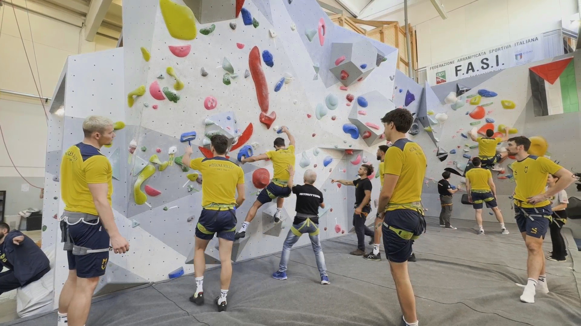 Con l’esordio in Superlega sempre più vicino, Modena Volley prosegue la propria preparazione con lavoro dentro e fuori dal campo. Ieri i canarini hanno svolto una sessione di allenamento un po’ diversa dalle solite, svolgendo un’attività di team building presso la palestra Equilibrium a Modena: una lezione di arrampicata, per apprendere qualche segreto di una disciplina che condivide tanti valori con la pallavolo, primo tra tutti la fiducia nei compagni. Al termine dell’allenamento, a raccontare il momento dei gialloblu, che esordiranno in campionato lunedì sera a Milano, è stato l’opposto Paul Buchegger. In vista dell’inizio del torneo, sono stati definiti date ed orari degli impegni dalla 5^ all’8^giornata, in cui Modena giocherà quattro gare in quindici giorni: si parte domenica 16 Novembre con la trasferta contro Cisterna, per poi proseguire giovedì 20 con Padova al PalaPanini e domenica 23 a Cuneo; a chiudere il mese di Novembre sarà l’impegno di domenica 30, sempre tra le mura amiche, con Grottazzolina.