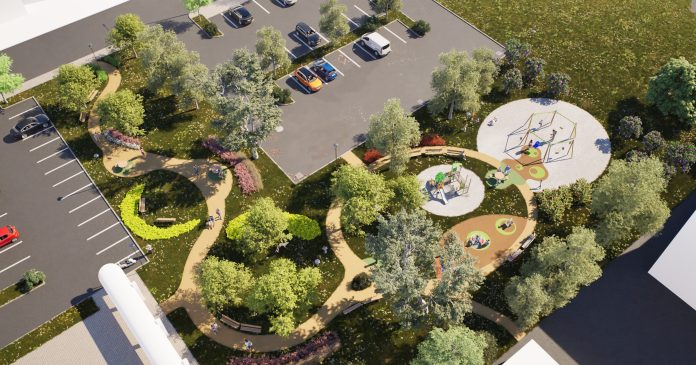 Il progetto in particolare ridisegna e ridefinisce accessi e percorsi pedonali all’interno dell’area, secondo forme curvilinee che ammorbidiscono il rigido impianto dell’intorno e che si pongono in sintonia con le numerose essenze a verde di progetto e le aree ludiche di nuova installazione.